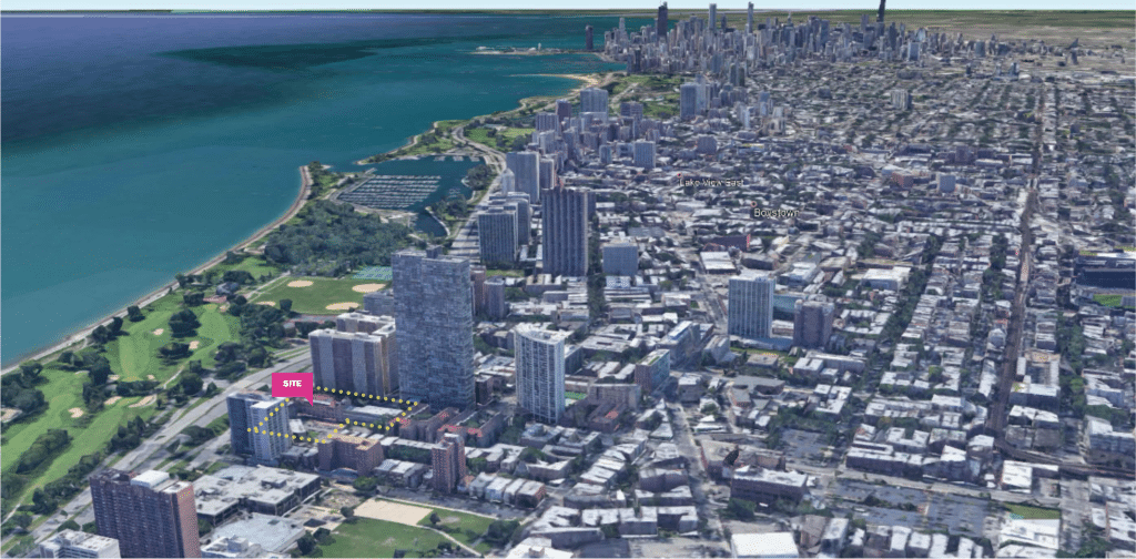 The approved tower will have permanent, unobstructed views of Lake Michigan from most of the units, which are highly desired in Chicago. The renderings shown below were created for entitlement approvals.