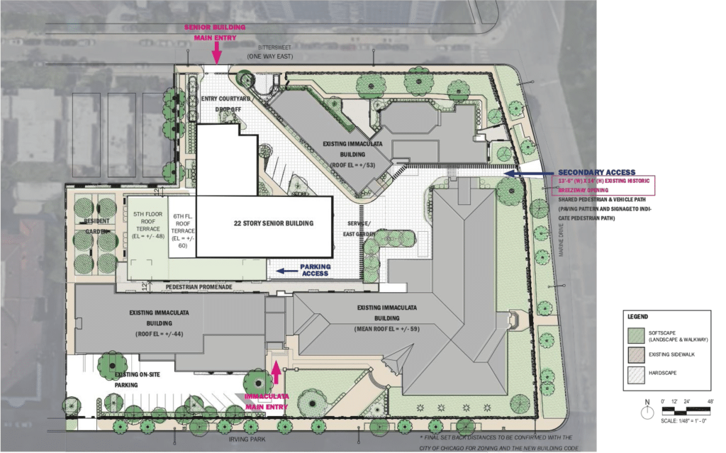 Immaculata Living offers a unique opportunity to create a housing campus in a coveted location. It is adjacent to Lake Michigan and Lake Shore Drive, and steps away from the Sydney Marovitz Golf Municipal Course and public beaches, as well as shopping and dining in the Lakeview neighborhood. It’s next to public transportation, and just a few blocks from Wrigley Field (home stadium of the Chicago Cubs professional baseball team), surrounded by a mature residential neighborhood. See the location on Google Maps.